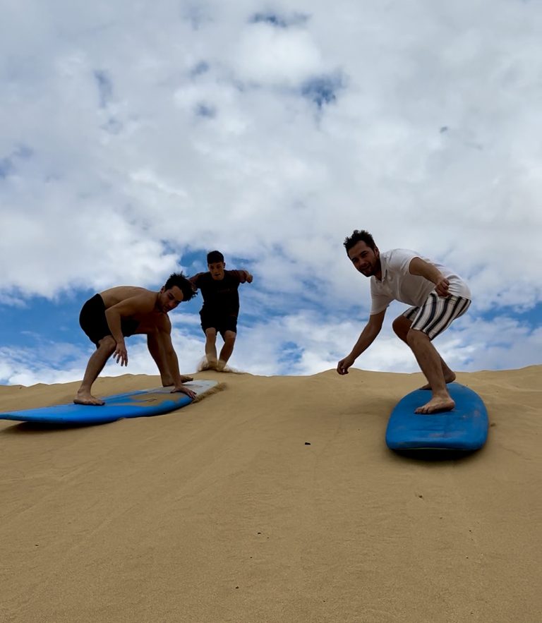 As you gaze upon the dunes and the ocean, we will prepare an authentic Moroccan tajine meal that we will enjoy together in the magical desert surroundings. A walk among them will reveal the unique play of shapes and shadows that create a true desert fairytale. Nature here has created fascinating rock formations shaped by sand and wind over the centuries. If you love surfing the waves, you will be thrilled by sandboarding – surfing on the sand dunes! Slide down the golden hills, feel the adrenaline, and enjoy the spectacular view of the ocean and the sunset.